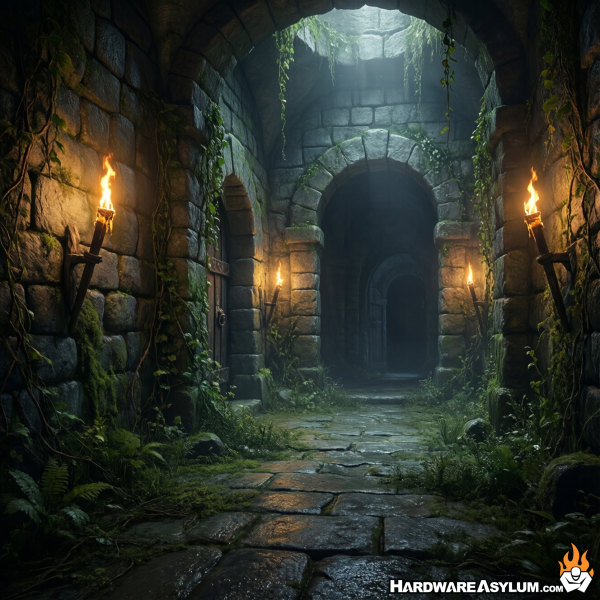 Stone walls, moss and vines covering sections of the walls, flickering torch lights casting long shadows, damp stone, rough-hewn stone blocks, arched doorway in the distance, slightly overgrown, fantasy setting, detailed, high resolution