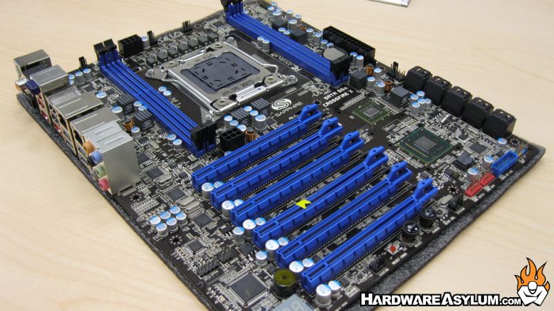 Right now you will find a total of six 16x PCI Express slots on the Pure Black X79. The layout isn't likely to change but you never know what might happen before they go to market. The layout supports triple card configurations in SLI and Crossfire assuming standard dual slot video card coolers.