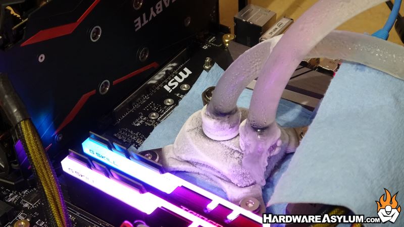 If you look carefully you’ll notice a lot of frost and a lot of liquid water on the coolant loop. During my overclocking runs the Vodka would get close to ambient as it left the CPU block and caused the tubes to sweat. This dropped liquid water on the block which quickly turned to ice.