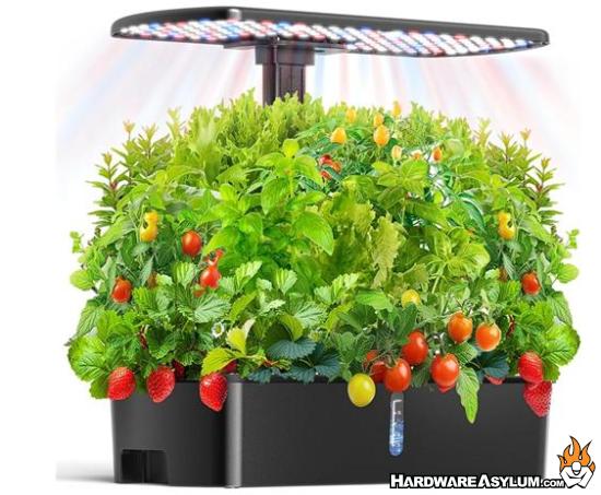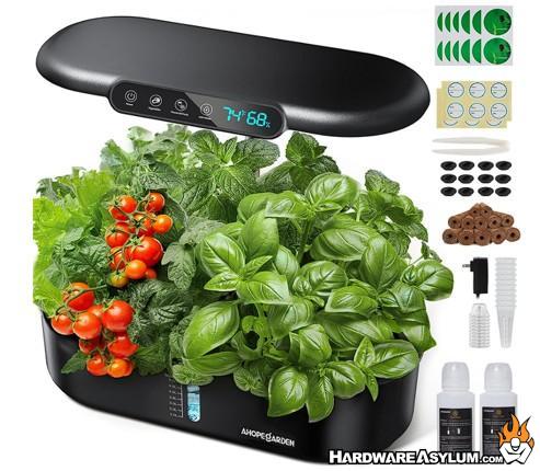 Ahopegarden’s 12 pod kit is the more data friendly option. It adds an LCD screen with real time temperature and humidity readouts, which might be overkill for casual users but is very satisfying if you are the type of person who likes to know what is happening in your little indoor greenhouse. The system runs a 16 hour on and 8 hour off light cycle using a full spectrum LED array, and the brand claims around 300 percent faster growth compared with soil under ideal conditions.