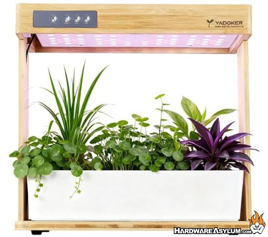 Yadoker’s system is the stylish one in the group. It is a smaller eight pod garden with a bamboo style base and a slim aluminum light arm, so it looks more like a piece of decor on a desk or kitchen counter than a pure gadget. Underneath that design, however, you still get a 24 watt full spectrum LED panel, a 3.5 liter water tank, and an automatic pump system that circulates water and nutrients on a timer.