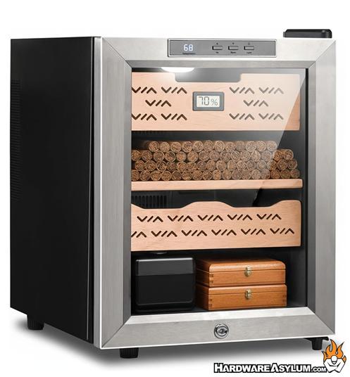 - Key highlights: Sleek stainless steel and black finish; battery-powered external hygrometer for easy monitoring; removable cedar trays for flexible stacking.