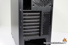 There are eight expansion slots along the back for added peripherals and grommets along the top behind the chassis to run external coolant pipes or wiring for external devices. The benefit of the eighth expansion slot is many motherboards are now embracing three-way and four-way multi-gpu setups. With a standard chassis only supporting seven slots, builders are limited to only having a single slot for their cooling solutions, or a maximum of three-way multi-gpu configurations. The eighth slot provides a much-needed added utility slot for many builds.