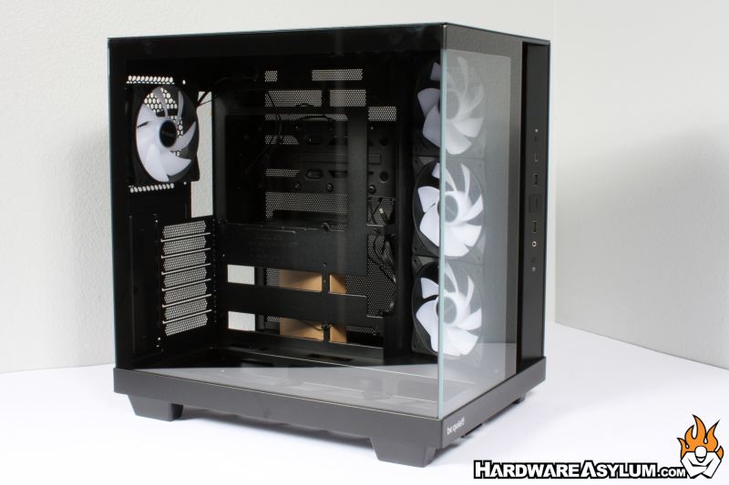 A term I prefer to use when describing a dual chamber chassis “Corner Office” since the design allows you to see everything going on inside the case. The Light Base 500 LX features two full height tempered glass panels that show everything inside the motherboard section of the chassis. These are clear glass panels with no shading applied and a few strips of color to hide the mounting rails that have been bonded to the glass.