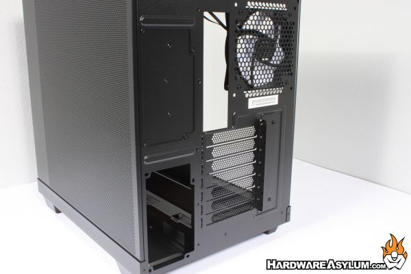 Turning the case around will expose a fully perforated back panel. I have seen many different panel designs over the years from sheets with embossing for additional cable access to fan holes and even tempered glass. I must say I am not a fan of perforated metal. Sure, it looks cool but really serves no practical purpose, screws up airflow, makes the panel weaker and will be full of dust in a matter of months.