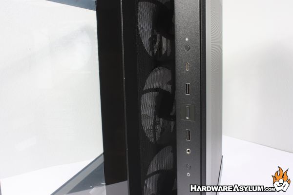 Front panel connections are located on a vertical pillar to the far right of the Light Base 500 LX. These controls consist of three USB ports including a single Type-C, large power button, reset button, analog audio jack and a button to control the included RGB controller.
