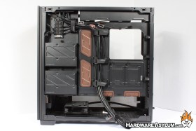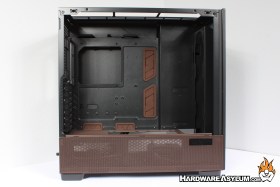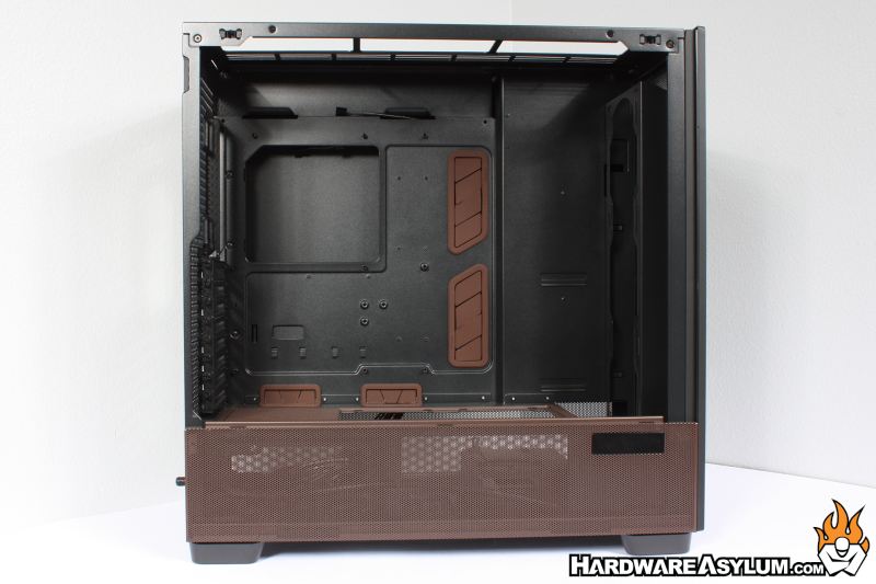 With the tempered glass side panel removed we can get a good look inside the Antec Flux Pro Noctua Edition chassis. As you would expect you will find brown grommets added to further enhance the edition color scheme along with another color matched detail at the bottom of the motherboard tray.