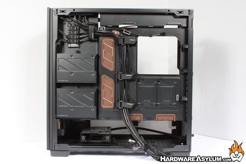 Turning the case around you can get a good look at the internal storage options and cable routing opportunities the Flux Pro provides.