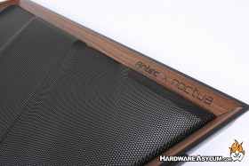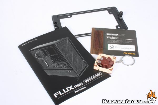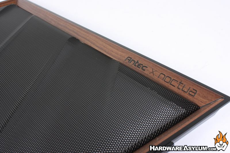 The Antec Flux Pro Noctua Edition builds on this by adding a few personalized customizations, the largest of which is a selective coloring of certain panels from back to the darker Noctua brown. You can also find the Noctua name on the glass side panel at etched into the walnut paneling on the front bezel. At first, I was skeptical about the authenticity of these wooden slats but, you get a woodchip sample in the accessory package and the screws used to hold the wood in place are at the correct cadence and appropriate size for the material.