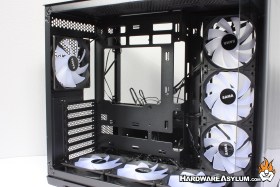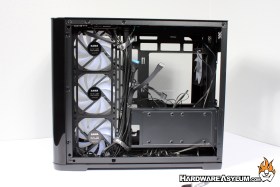 With the side panels removed we can get a good look inside the case. On the glass side of the V60 there isn’t much that you haven’t already sees. However, from the reverse side the side cooling fans are exposed along with a dual drive mounting plate. This plate supports both 2.5" and 3.5" storage drives.