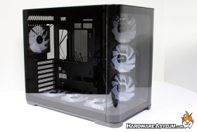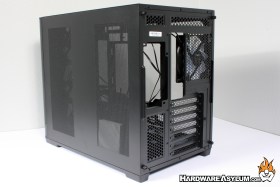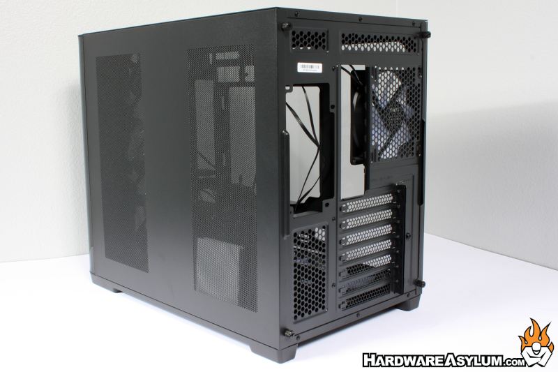 Due to the position of the components the case is quite a bit shorter than your standard tower but, quite a bit wider. From the front of the case you can see the curved glass panel across the front of the case while the back features ample mesh perforations to promote active cooling.