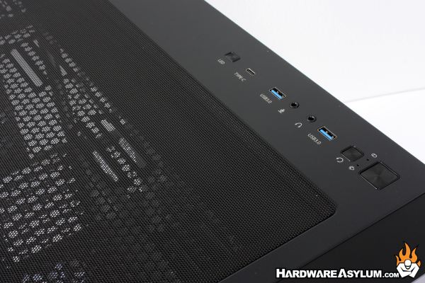 Front panel controls are located at the top of the case including a large power button, smaller reset button, two USB 3.0 Type A plugs, analog headphone and microphone jacks, a single Type-C and small LED button allowing you options to spin through the pre-configured lighting patterns.