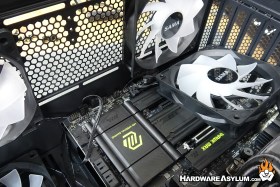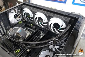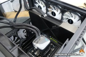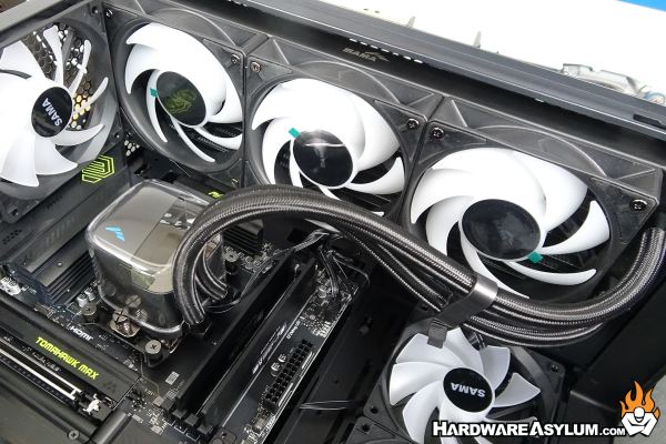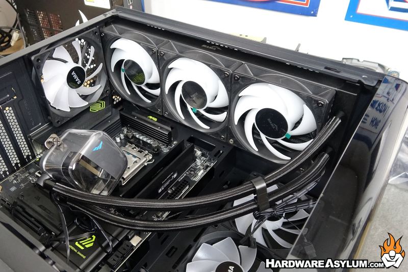 Once the wires had been sorted the pump block could be installed. After some twisting the cooler was attached. I did find it interesting that you cannot install the L70 on an AMD system with the hoses at the bottom of the pumpblock. The cooler only came with the short rails and thus limiting how the cooler could be installed.