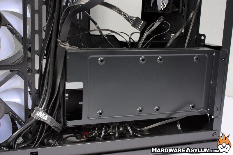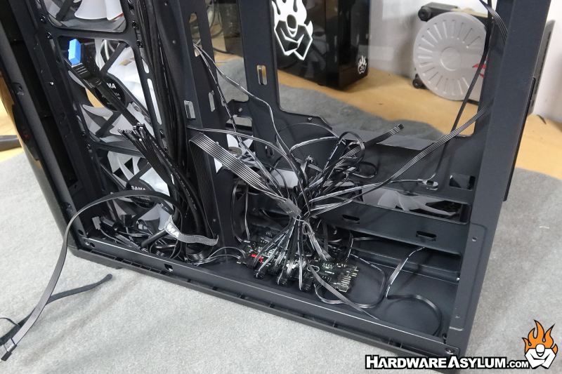 Flipping the case around I could install the G1000 PSU but needed some room to route the cables from the motherboard side. This is when I removed the SSD plate to expose a total rat nest of wires used to control the individual 120mm fans and their RGB lights. Granted these are behind the solid part of the motherboard tray but, make me wonder if maybe the case is too small for this many fans.