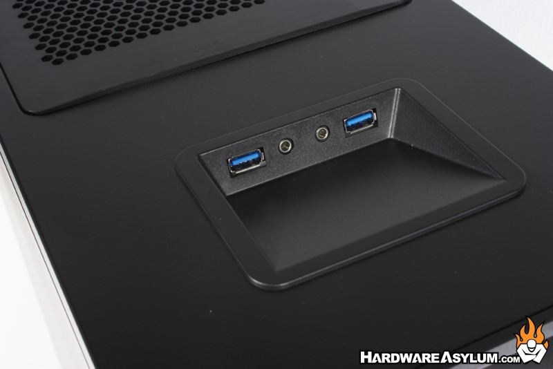 Front panel options are rather limited on the TJ04-E and consist of external audio for microphone and speakers and two USB 3.0 connections. You'll find these readily available at the top of the case and slightly recessed.