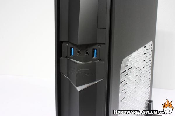 Front panel design resembles the bezel deign of RV05 with the long angled panels and sharp beak like structure in the center. You can find this design element on all Raven cases and is actually the “V” in the middle of the Raven logo. Sliding this panel down will expose the external USB 3.0 ports and analog audio jacks for mic and headphones.