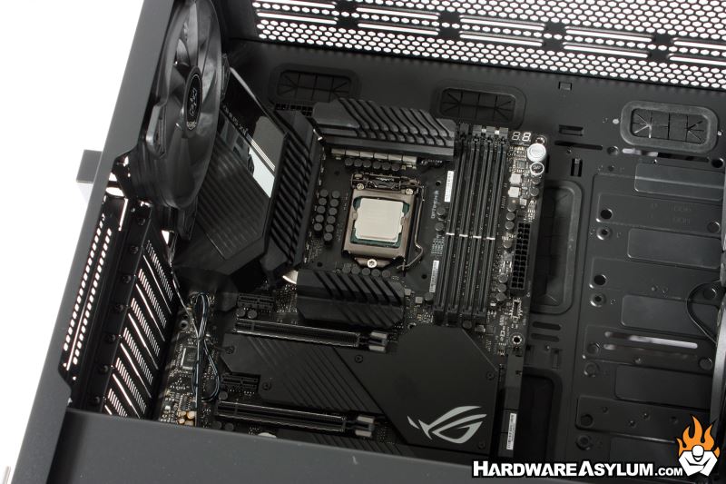 Cooling access for the motherboard is quite good with plenty of room at the top for fans and radiators and enough offset to clear the oversized motherboard VRM heatsinks.
