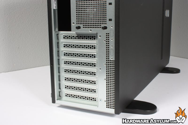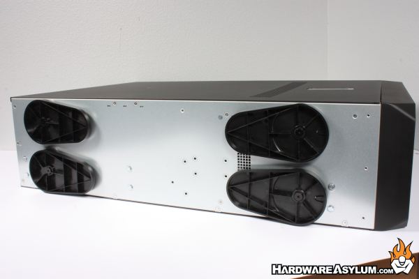 The SilverStone WS380-E is delivered supporting a standard tower configuration and the feet can be turned inwards to be more compact. From here you can clearly see a number of small posts embedded into the chassis panel. These are where the optional rack mount rails attach making this case rather versatile when it comes to installation options.