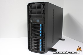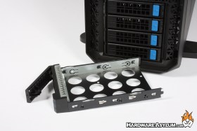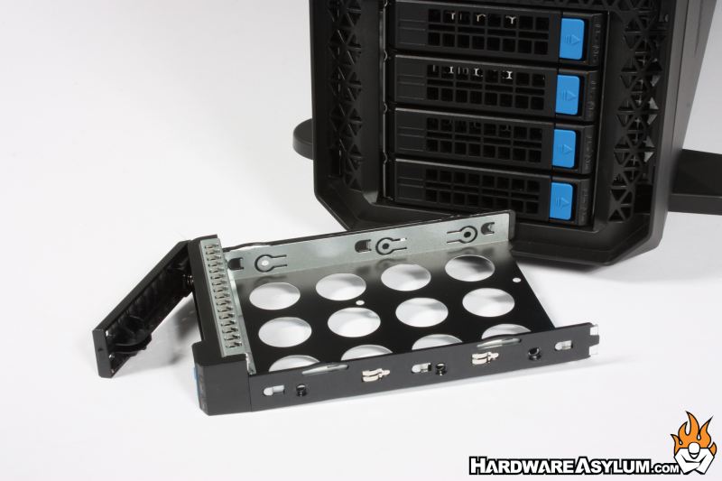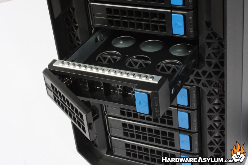 Hot-swap storage is handled extremely well with 2x four drive SATA/SAS drive cages. These cages are built quite well with a positive lock and pull handle combined with a plastic wrapped metal frame. The frame supports both 3.5” and 2.5” drives.
