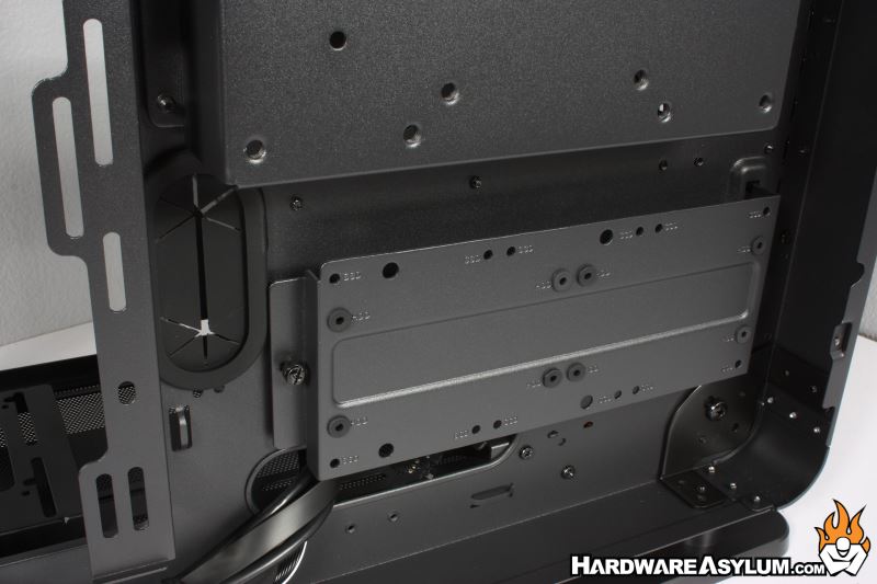 The back panel can be removed with six screws and exposes the various HDD and SSD storage racks. You’ll also find that the area behind the motherboard is HUGE when it comes to cable storage with around 2 inches of depth.