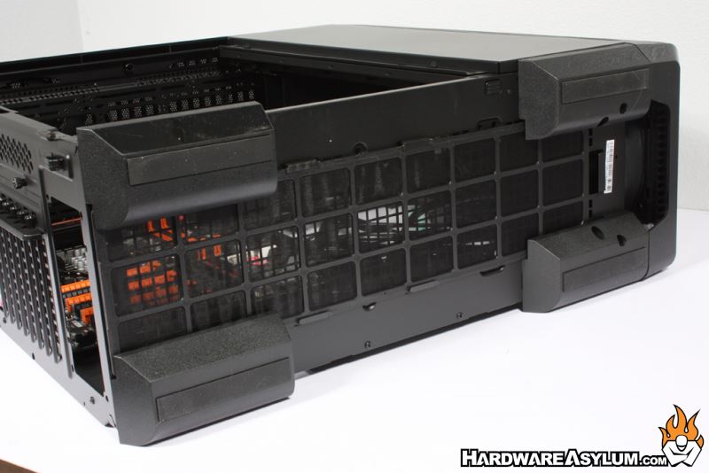 Everywhere you look on this case there is mesh and fan/radiator mounts. Another stretch of ventilation runs the entire length of the T81's underside and is covered in a fine mesh to keep out dust and debris. The mesh is removable for cleaning as well, but does slide out from the back. Mounting brackets inside the chassis allow up to a 280mm radiator to be installed along the bottom, or a pair of 140mm fans. Placing fans or radiators there however, will reduce clearance for your power supply.