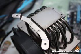 Mounting rails, like this, have become a popular option for installing heatsinks and despite their popularity we have found them difficult to use. During the installation process we found ourselves having to remount the heatsink several times due to clearance issues and occasional miscalculation in alignment. Keep in mind we test on an open bench so the motherboard is often bare and easy to move around. Had our system been installed in a chassis we may have needed a second person to hold the heatsink in place while the four mounting screws were tightened.