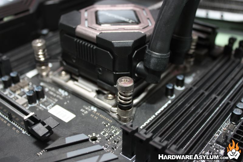 Four spring nuts are used to hold the cooler in place. It is important to slowly tighten them in an X pattern to apply even pressure to the CPU. This helps ensure a solid mount and the best thermal connection.