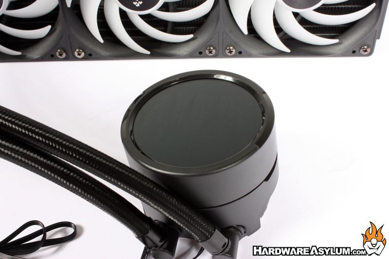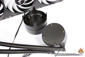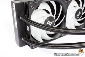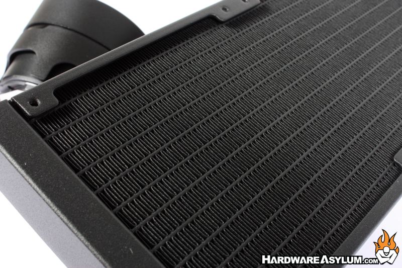 For the radiator the form factor is completely square and a little boring. In fact, it looks like most any AIO radiator, simple and yet functional. Fin density is extremely good reminding me of many Cooler Master designs that required high pressure fans to work efficiently. When it comes to cooling there are two touch points. First where the water meets the cold plate and Second where the water meets the air. Poor load temps will occur at the pumpblock if the water is struggling to pick up a thermal load. Poor thermal capacity will occur if the radiator cannot dump heat from the system. Proper fin density at the radiator ensures that noise is kept to a minimum and temperatures stay in check.