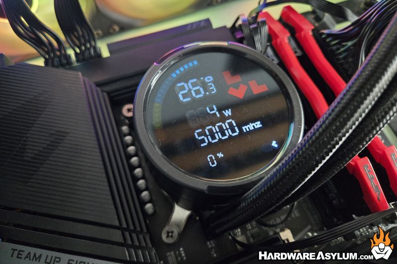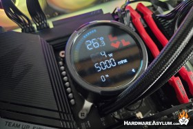 Maybe the most unique feature is the Combat Liquid HUD. This isn’t your typical LCD screen as it won’t allow you to watch your favorite anime or adult entertainment but rather shows some interesting vitals about your system. The obvious will be CPU temperature followed by CPU frequency and system loading. System loading is where things get interesting. The normal load is show at the bottom using the “V” graphic from the Levelplay logo with a number to the left. At the top is a segmented sweep graph and will move with system load but responds to the wattage output of the CPU.