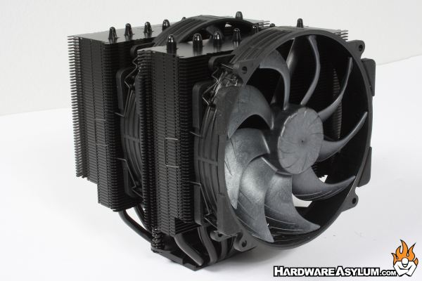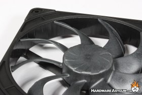 Noctua had a similar fan design that used their focus flow frame design with variable pitch stator guide vanes. The purpose of this design was to redirect the air existing the fan from the typical cone shape into more of a column that not only helped to direct airflow but improved heatsink efficiency by providing more airflow over critical cooling components.