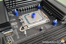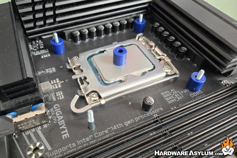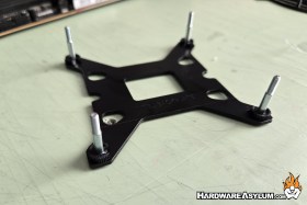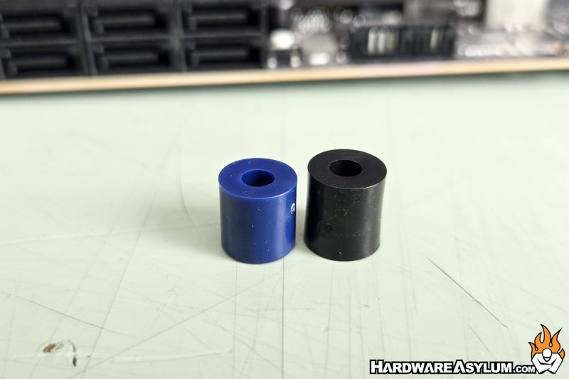 Next locate the plastic spacers and slide them over the four posts from the backplate, Pay special attention to the color. LGA1200 spacers are black while LGA1700 will be blue. The difference will alter the finished height of the mounting rails and could either prevent contact with your CPU or provide too much mounting pressure.