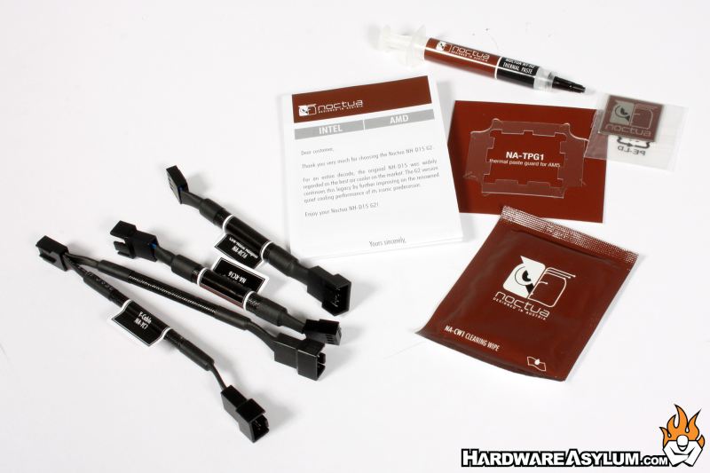 Included with the NH-D15 G2 you will get thermal compound, paste guard for AM5 processors, quality stamped metal case badge with the Noctua logo, NA-CW1 cleaning wipe, fan splitter and two low noise adapters.