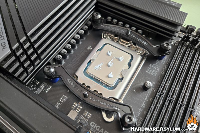At this point I like to install the thermal compound. I prefer the 5-dot method, simply dab five small blobs of paste in the pattern pictured and you are set. For this review I’ll be using the Noctua NT-H2.