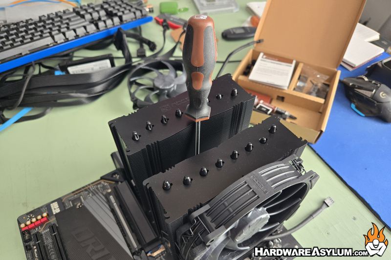 Dual tower coolers like the HH-D15 can be quite large and while there are cut-outs for memory access, I did run into clearance issues when using the Patriot Viper Xtreme5 DDR5 modules shown here. The solution was to simply install the fan upwards to clear the modules. Had this not worked, I would have removed the fan.