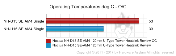 As the charts show we have a heatsink that can clearly handle more than the system can dish out. In terms of raw temp the 53c load under overclocking is a little higher than expected given the wattage output but, is very consistent between the tests and against the NH-U12S.