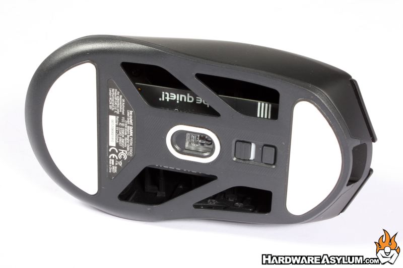 From the bottom, we can see the open skeleton design to save weight. Two large skates provide smooth contact with your mousing surface. In front of the excellent PixArt PAW3950 sensor are the wireless toggle and the DPI button. It is an odd choice to hide the DPI on the bottom.