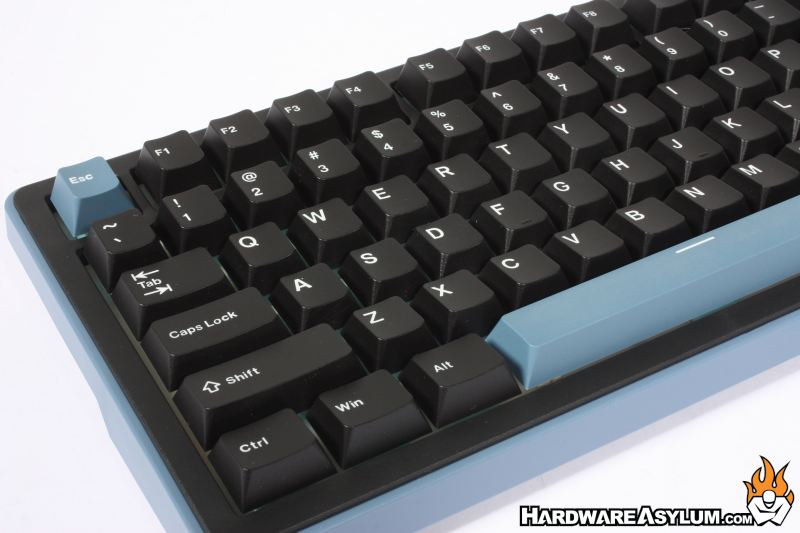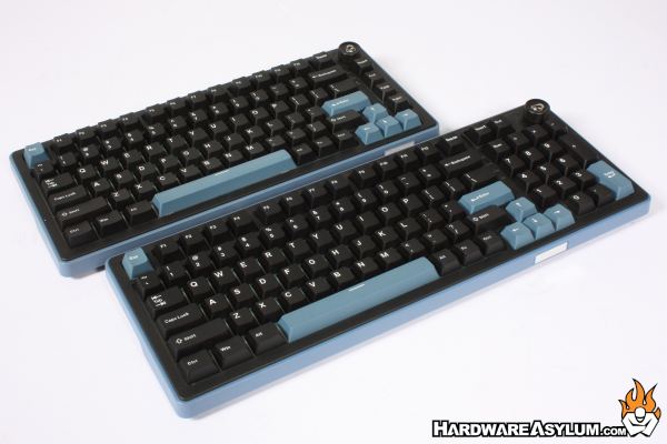 This picture compares the OK-M-75 to its full-sized brother, the OK-M-98. Both make excellent use of space and offer an exceptional typing experience via the hot swappable KTT Linear / KTT Tactile Baby switches. In this case the KTT Baby Whites (Linear).