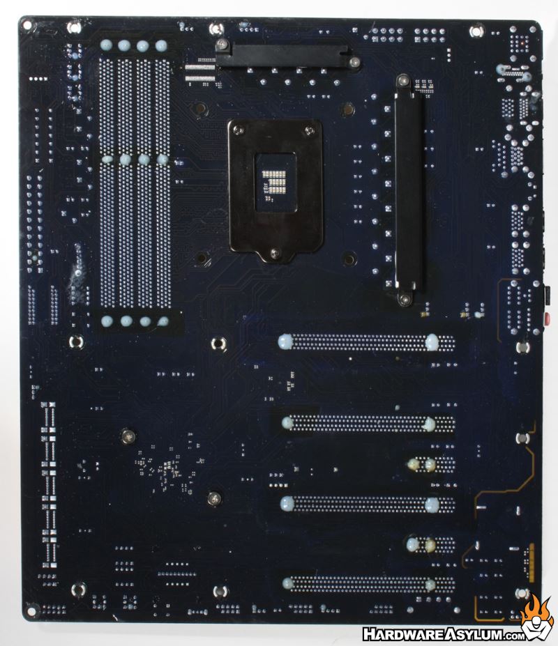 Flipping a motherboard over can tell you a lot about its construction, to a certain degree. We can see that the back of the motherboard is virtually devoid of any surface components aside from two VRM heatspreaders and a CPU reinforcement bracket. Unlike some of the other motherboards we have reviewed each 16x PCI Express slot has been wired the entire length so it will be difficult to know eaxatly how many lanes each slot has without testing them.