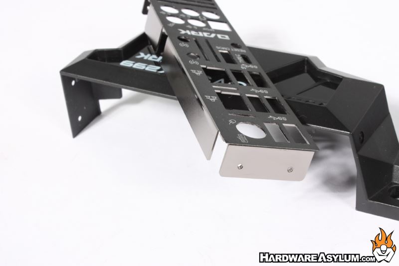 EVGA was one of the first companies to offer an I/O cover that helped clean up custom builds by hiding the “ugly” onboard connections. With the X299 Dark EVGA has added a secured I/O shield that is held in place with three screws. This really dresses up the motherboard when running on an open test bench (the Dark’s normal home) but can be removed for standard case installations using the included I/O shield.