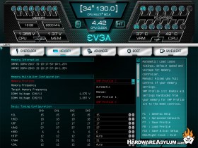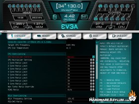 EVGA has spent considerable effort to redesign their UEFI implementation and the results are quite amazing. At the top of the UEFI menu you'll find a quick reference display that gives you all of the vital statics about the system including what memory slots are populated, the speed of the installed video cards and various voltages and temperatures. In the middle you will find the calculated CPU speed showing both BCLK and multiplier.