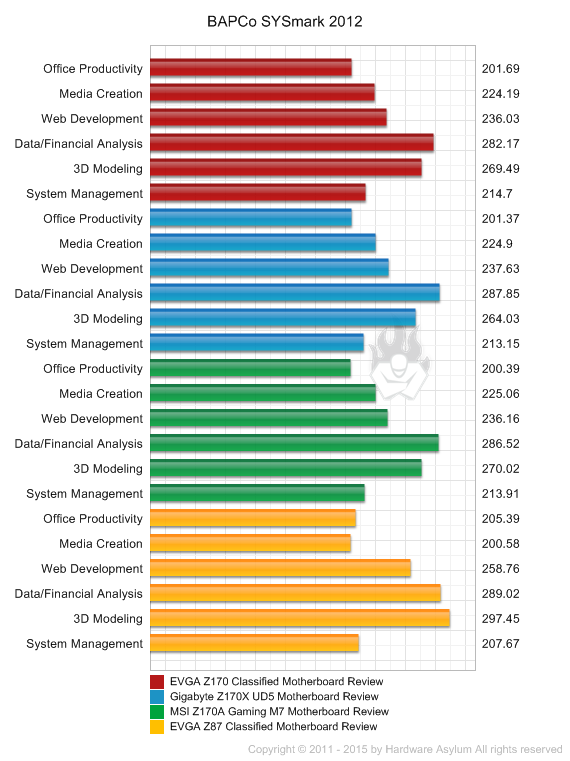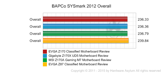 When we test our systems we do so with the default and auto assigned settings in place so to represent un-turned and out of box performance. (read: default user setups). Your performance may vary depending on the time you spent tuning your hardware. Again, just like with the synthetic tests both motherboards perform identically, in fact they seem to be on rails. Go Skylake it would seem.