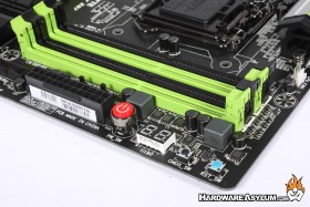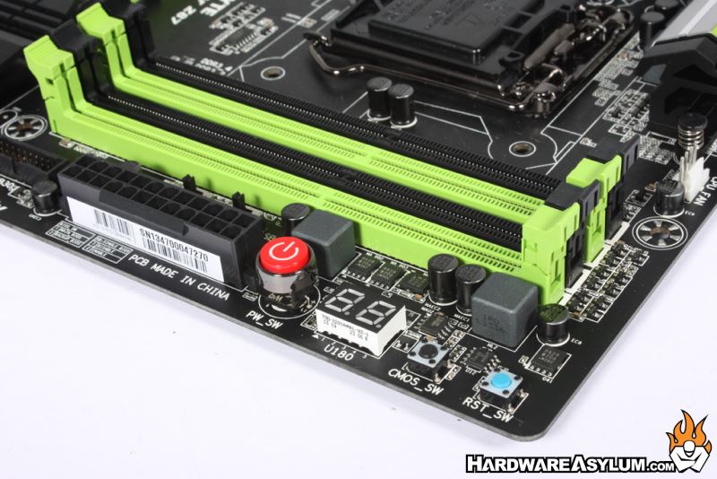 Dual channel memory comes standard on the Haswell processor and the G1 Sniper Z87 supports DDR3 modules from 1333Mhz up to 3000Mhz (under overclocking). A maximum of 32GB is addressable however a 64-bit OS is required to use it all. 24pin ATX power is located in the traditional location near the upper edge of the motherboard and out of the primary airflow.