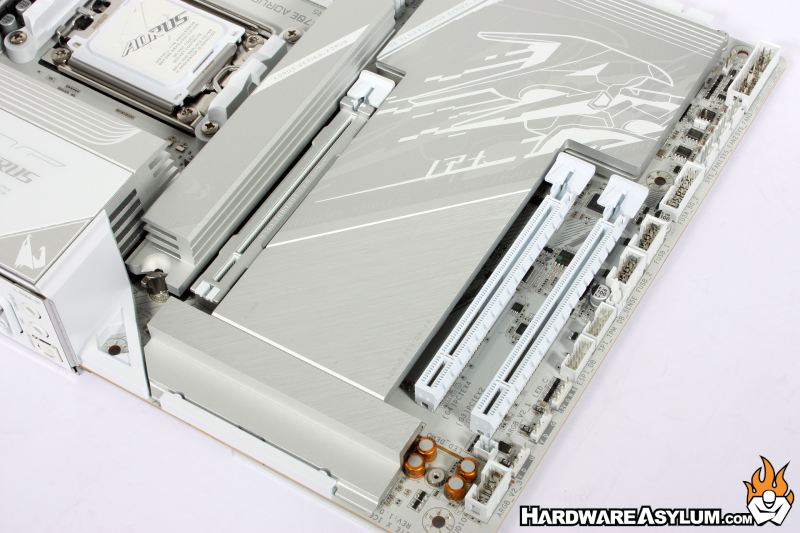 In the place of the usual PCI Express expansion slots, you will find a total of four M.2 sockets. Three support PCI Express 5.0 while the remaining only supporting PCI Express 4.0. All are cooled by integrated cooling solution to keep the drives from throttling. The top slot is using bandwidth from the CPU and also comes with the largest heatsink of the bunch. You’ll want to use this one for your primary drive while the others can be for storage.