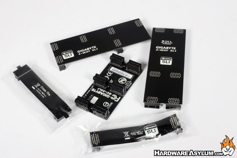 We have come to expect more goodies from our high-end motherboards. The extras help to justify the additional cost and sometimes help pad the parts bin for when you need replacement cables and video card bridges. Gigabyte has included everything you see below which includes six SATA6 cables (with locks), manuals, I/O shield, driver disk and Crossfire bridge and four SLI bridges for 2-way, 3-way(1) and 3-way(2) and 4-way card configurations.
