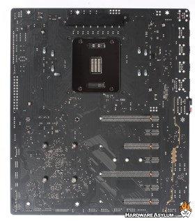 Looking at the back of the motherboard we can get an indication as to how the PCI Express slots are wired and determine which slots are primary and secondary in terms of bandwidth. There are a few surface components found on the PCB and one rather large heatspreader directly under the VRM. Given that X79 suffered from performance problems related to VRM heat having a heatspreader here makes total sense.
