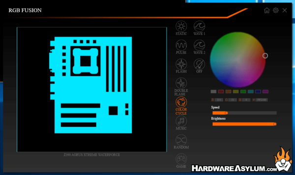 The Aorus Z390 Xtreme Waterforce comes equipped with RGB Fusion 2.0 which can be controlled using the RGB Fusion app. By default the Z390 Xtreme will show an unlisted RGB lighting effect. This effect will do a color wash over the motherboard, blink off and wash with the next color in the rotation. Honestly one of my biggest complaints is not being able to select that mode in software