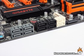 Internal SATA connections number ten. The black connections are SATA3 spec while the white connections follow the new SATA6 connection standard direct from the Z77 chipset. Gigabyte has included a secondary Marvell SATA controller that gives you four additional SATA6 connections or can be disabled completely in the UEFI. To use them connect your drives to the grey connections shown here.