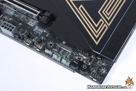 There is a lot going on around the memory sockets. To the right, you’ll find several PWM fan headers and a single ARGB connection and EZConn interface. In place of a digital debug LED you will find four small LED lights that will indicate the different boot stages and will illuminate the error regions if there is a failure. For instance, a memory fault will trigger the third LED to help users track down the issue.