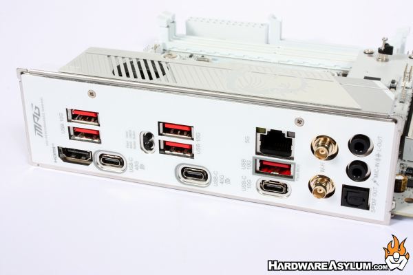 The I/O panel is always an interesting part of the motherboard as it dictates what connectivity options will be available. Starting at the left we have two of the six available 10Gbps USB ports above a single HDMI for processors with onboard video. This is followed by two small buttons for Flashing and Resetting the BIOS. Below those are two 40Gbps Type-C ports. A single 5G Ethernet connection is available followed by the two WiFi 7 antenna connections.