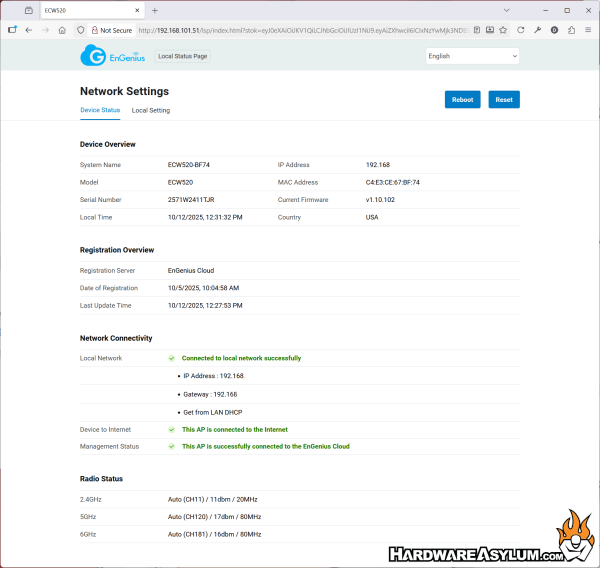 Installing the EnGenius Cloud7 access point is no different than any other device. First, I setup the PoE adapter, ran a network cable from my switch to it and another cable from the adaptor to the ECW520. From there I connected the power and the device sprang to life.